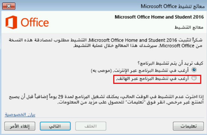 حدد الخيار الثاني ارغب في تنشيط البرنامج عبر الهاتف